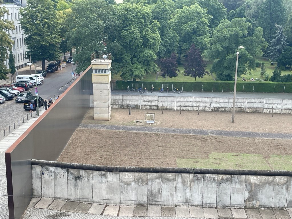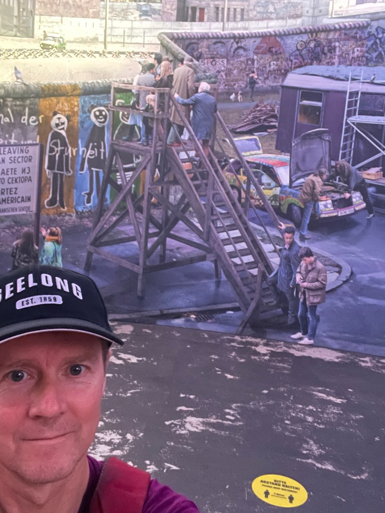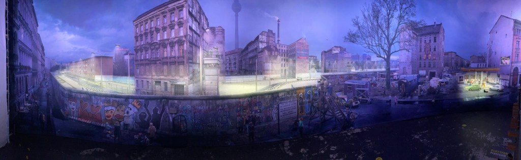 Along the way, we found an excellent art exhibition inside a 18m high by 32m diameter rotunda. It was a digitised version of a panoramic painting the artist had done of a scene from the 1980s that shows both sides of the wall from the viewpoint of a building on the west side. It was at 1:1 scale and with the curved wall it really felt like you were in the scene.