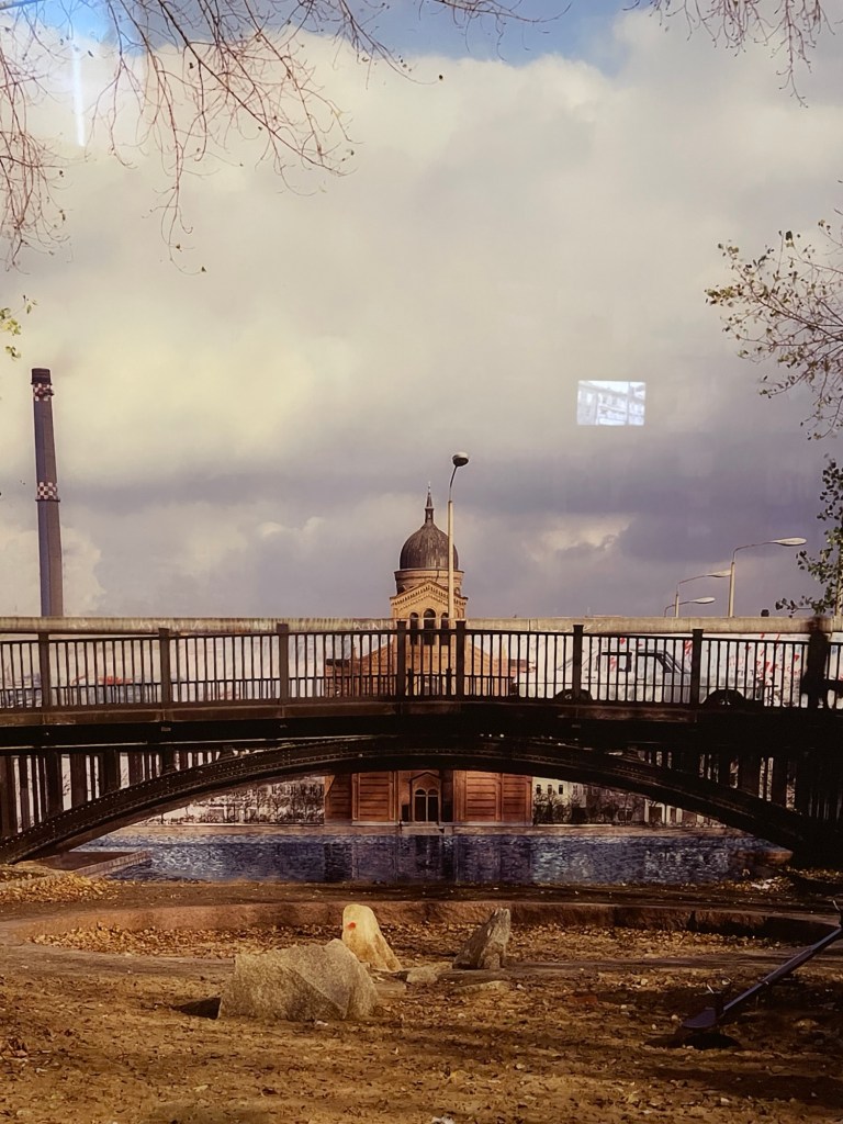 There was also a photo of a painting the artist did on the actual Berlin wall that makes the wall disappear. In the image below, only the very top of the church and the bridge are real – the rest is a painting on the concrete wall behind the bridge.