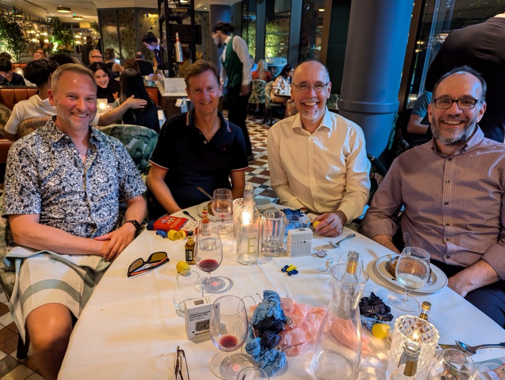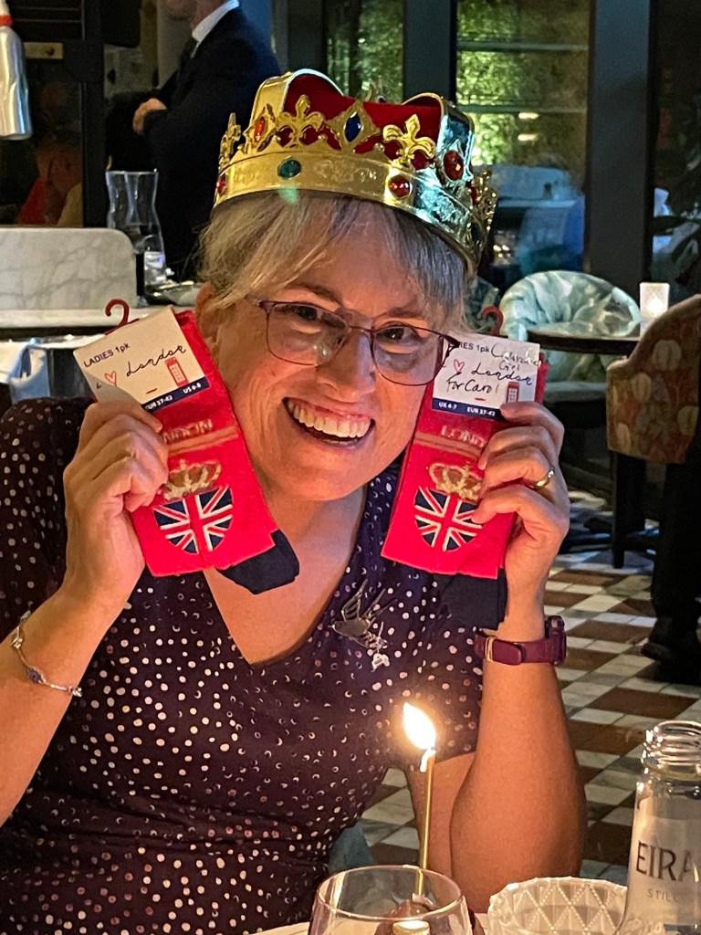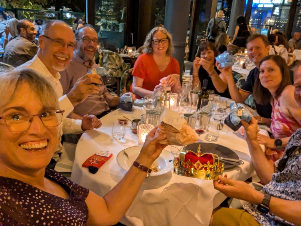 It was a quick hello to Eleanor as she was heading out for dinner and we also headed back in to Tower Bridge for dinner at The Ivy with the old softball crew from when Mamfa and Mawfa lived in London in 2001-02. Fantastic to catch up with Duncan and Becky, Dave and Sara, and Tim and Wendy. Sara had little gifts for everyone including socks, kinder surprise and little bottles of alcohol. It was a really fun night.