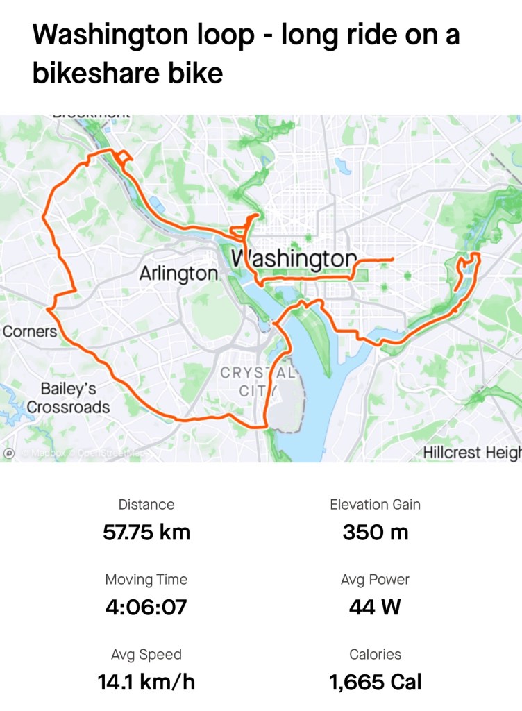 Today was a long bike ride around DC using the bike share bikes (heavy 3-speed bikes in variable condition). It’s a good thing DC is fairly flat and has a very good network of bike paths. The bike share system is also great with over 170 docking stations. It was only $8 for the day as long as you docked the bike every 45mins – which was easy to do.